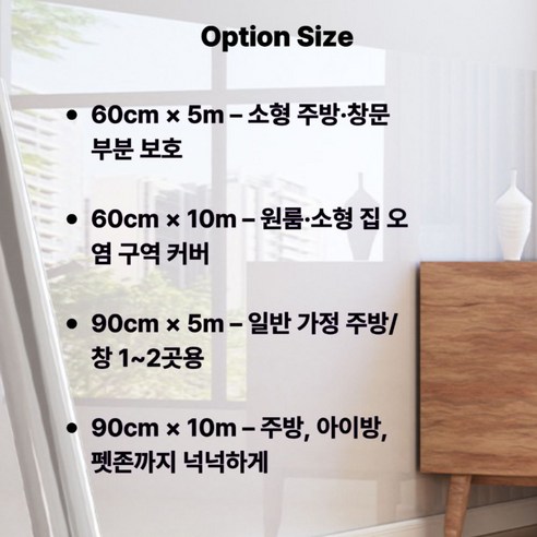 - 투명한 필름 디자인: 주방 인테리어 디자인을 그대로 유지하며 깔끔하게 보호합니다.
