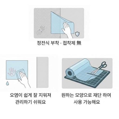 홈커버랩에서 나온 이 필름은 기존의 접착 방식과는 완전히 다른 개념의 제품이라고 해요. 정전기 원리를 이용해 벽면에 착 달라붙는 방식이라, 접착제 자체가 아예 사용되지 않았다는 점이 가장 큰 특징이죠. 덕분에 붙일 때나 뗄 때 벽면에 어떠한 손상도 주지 않는다는 점이 큰 메리트로 꼽히더라고요.